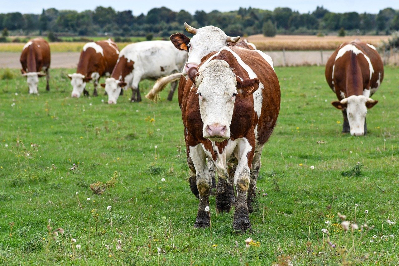 brown-and-white heifers in the field