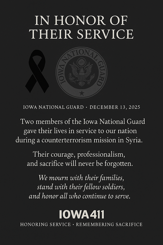 Iowa411 News Briefs for December 15, 2025, cover the identification of Sgt. Nate Howard of the Iowa National Guard, killed in an ISIS-linked attack in Syria, and the broader impact on Iowa communities.